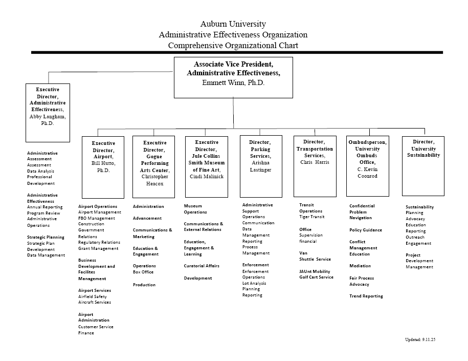 In addition, Dr. Winn oversees the Gogue Performing Arts Center, The Jule Collins Smith Museum, the Auburn University Airport, the Office of Sustainability, The Ombuds Office, Parking Services and Transportation Services. He also works closely with Auburn’s Facilities Management on matters related to a variety of non-academic facilities.